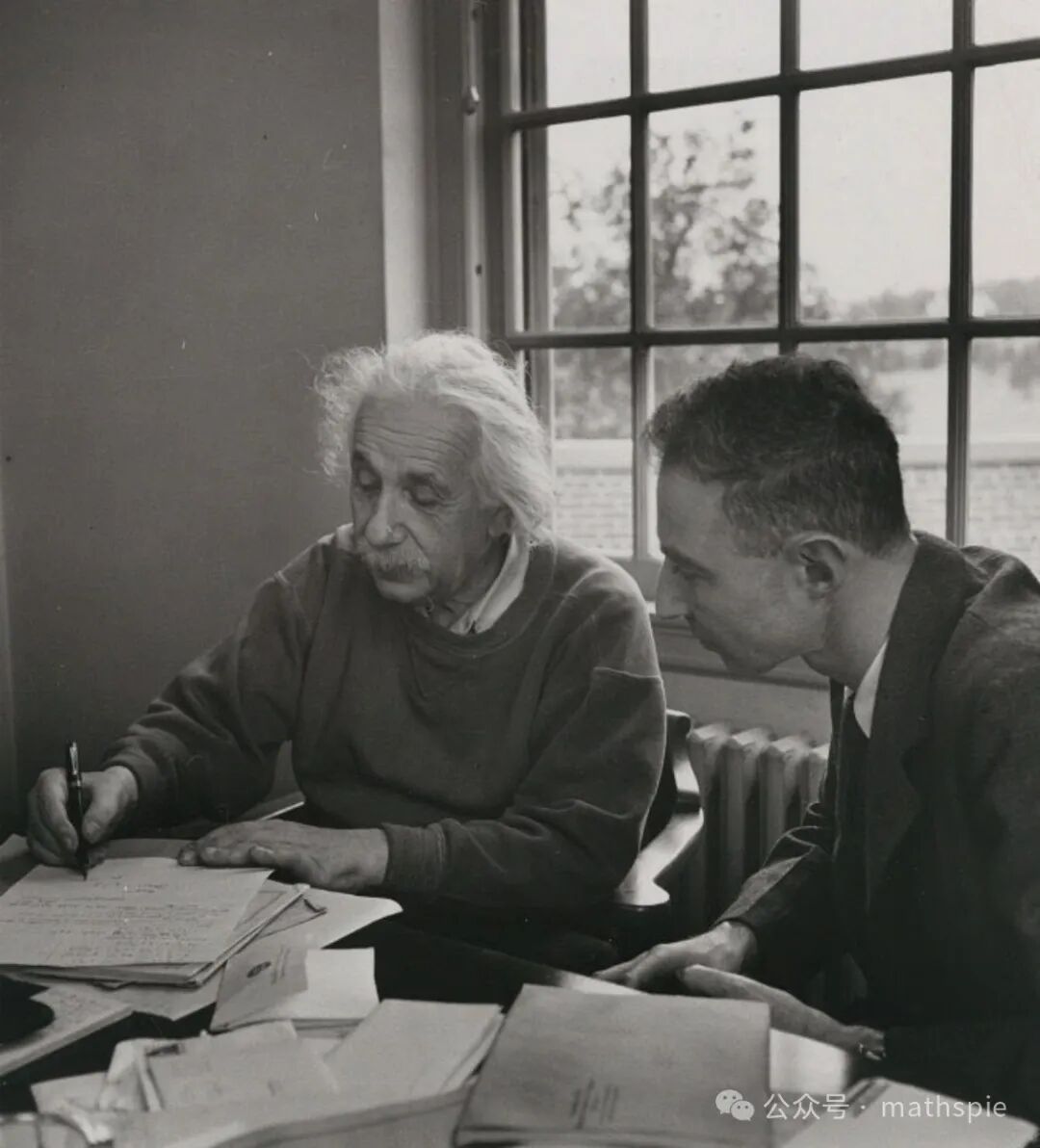 1947 年,物理学家奥本海默在普林斯顿高等研究院与爱因斯坦讨论物质理论。