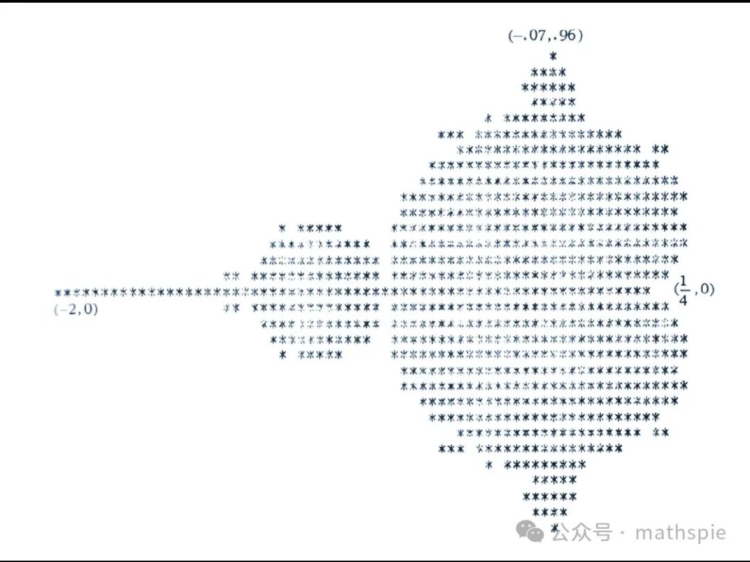 这是罗伯特-布鲁克斯(Robert Brooks)和彼得-马特尔斯基(J. Peter Matelski)在 1978 年发表的一篇论文中首次公布的用点阵打印机绘制的曼德布罗特集。后来,曼德布罗特努力使分形成为广为人知的图像,分形也因此得名。