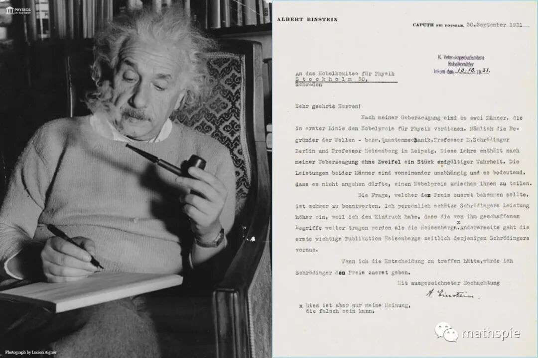 1931年9月30日,爱因斯坦为薛定谔和海森伯格获得诺贝尔奖写提名信。“在我看来,量子力学毫无疑问是真理,他们两人的成就是彼此独立的且是重大的,因而不合适让他们两人平分诺贝尔奖。问题是让谁先获得诺贝尔奖很难决定。我个人认为,薛定谔的成就更大,因为他创造的概念比海森伯格更深刻“。