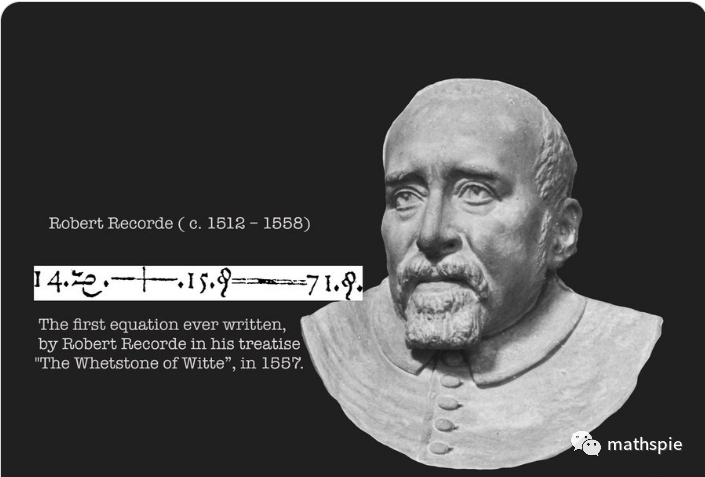 1557年威尔士数学家Robert Recorde 发明了等号。他写累了“相等”, 然后用两根平行线来表示相等。这一简单的符号给书写数学带来了革命。