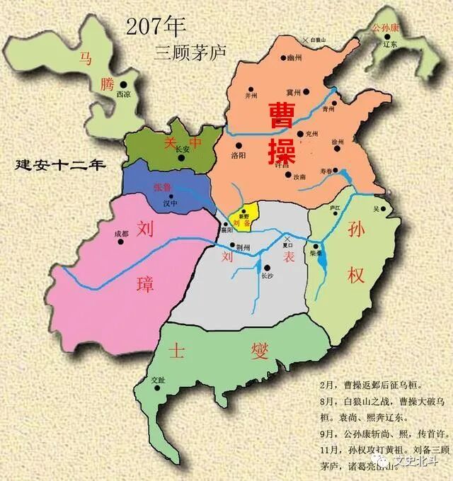 公元200年,曹操在官渡之战中击败了袁绍,从此在北方占据主动权。两年后,袁绍去世,袁绍的儿子就开始发生内讧,甚至火并。曹操就抓住这些机会,对袁氏各个击破,吞并了袁氏的冀、青、并三州,基本统一了华北地区。此时天下共有十三州,其中五个州在曹操手中。