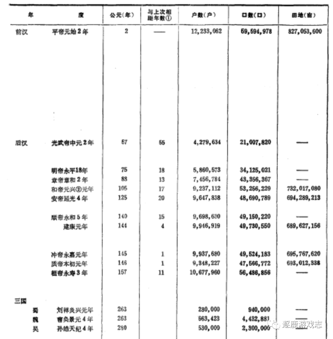 两汉三国人口、耕地统计表,可见三国时期人口锐减程度 / 数据来源 梁方仲《中国历代户口、田地、田赋统计》