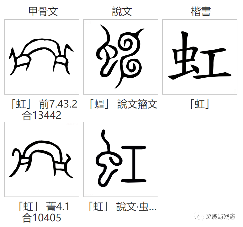 《三国演义》第一回就提到了一系列怪象,比如大青蛇从梁上飞下来、雷雨冰雹、大地震、海水泛溢、雌鸡化雄、有虹现于玉堂等等。当然,这其中有的明显不足为信,例如“有虹现于玉堂”。彩虹本来是正常的物理现象,古人却把虹想象成首尾都长着头的长虫,可以吸水,并据阴阳灾异学说认为彩虹生处将有大旱,发生旱灾则说明君主德不配位。这一想象流传甚广,“虹”字取“虫”字做偏旁也正因为此,甲骨文中的“虹”字形则更为直观,就是一条首尾长着头的虫。