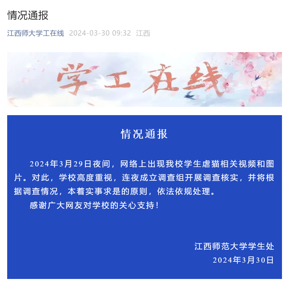 3月30日,江西师范大学学生处发布情况通报,称3月29日夜间,网络上出现了关于该校学生虐猫的相关视频和图片。学校对此高度重视,连夜成立了调查组,迅速开展调查核实工作。学校表示,将本着实事求是的原则,依法依规处理此事。