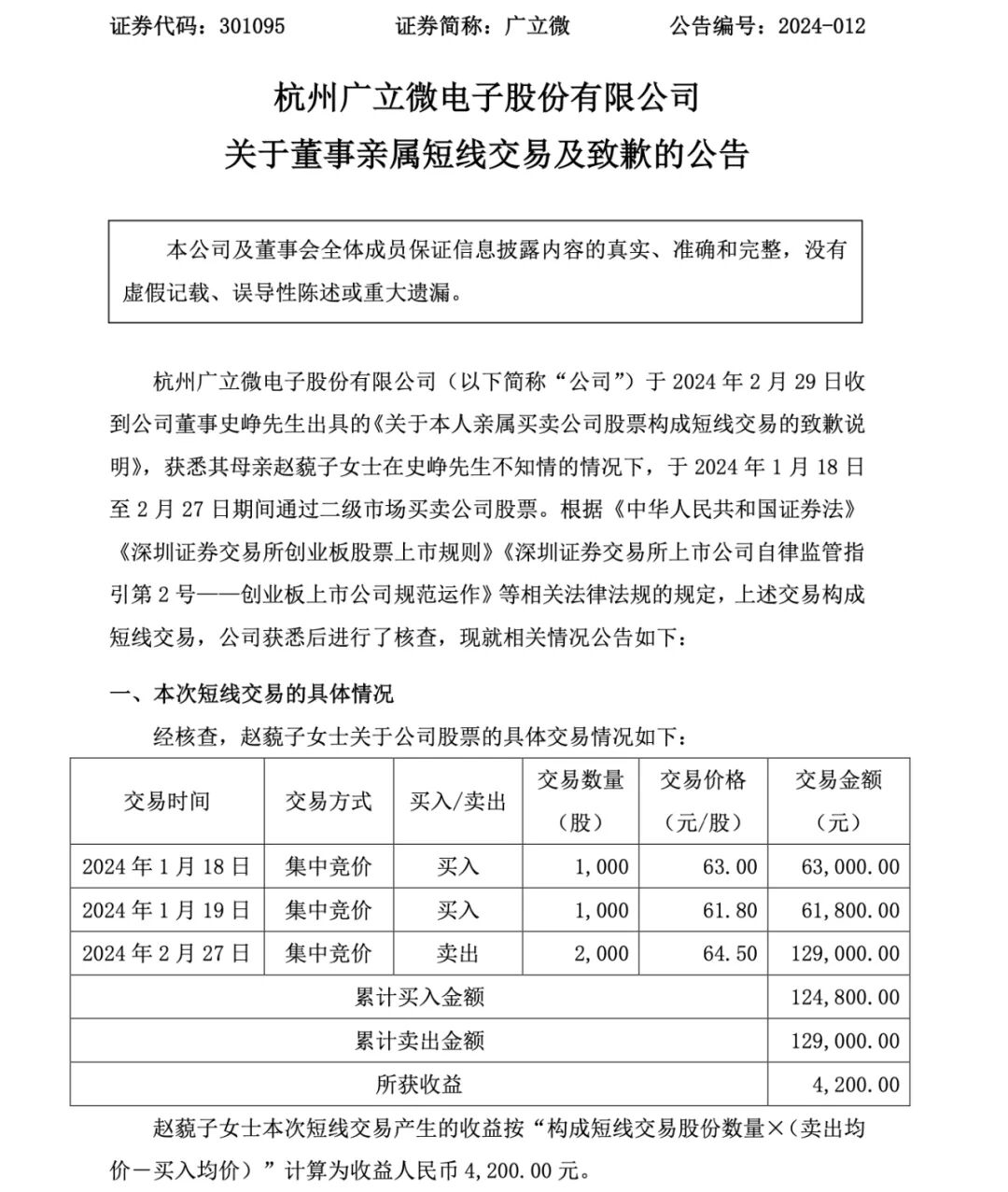 2024年2月29日,广立微收到史峥先生出具的《关于本人亲属买卖公司股票构成短线交易的致歉说明》。公告指出,赵藐子女士在2024年1月18日至2月27日期间通过二级市场买卖公司股票,未向史峥先生寻求任何意见或建议。据悉,赵藐子女士本次短线交易所得收益人民币4200元已于2月29日全部上缴公司。广立微表示,经核实,本次交易不存在因获悉内幕信息而交易公司股票的情况,亦不存在利用内幕信息进行交易谋求利益的情形。