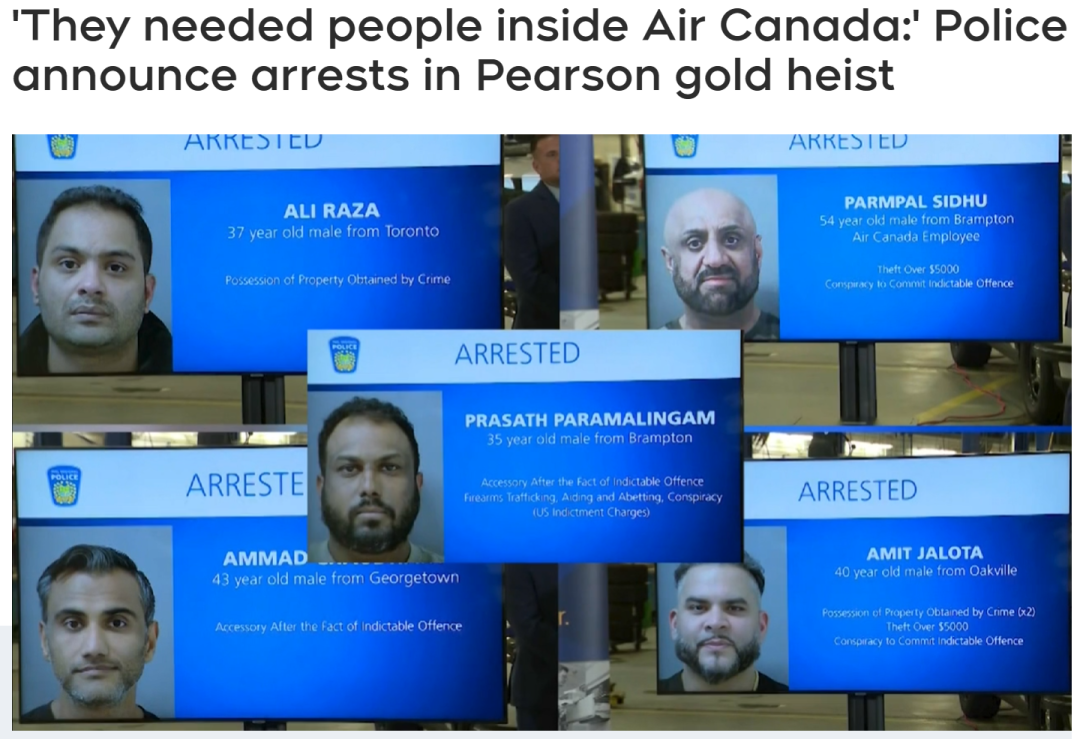 在加拿大大多伦多地区,一起发生在多伦多皮尔逊机场的黄金盗窃案震惊了全国。4月17日,当地警方在新闻发布会上宣布,这起一年前发生的案件已被侦破。警方表示,目前逮捕了5名嫌疑人,并对另外4人发出了通缉令。这些嫌疑人共面临19项指控。