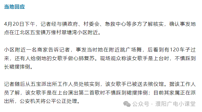 记者经与镇政府、村委会、急救中心等多方了解核实,从五宝派出所工作人员处得知,该女歌手已被送去殡仪馆。据该工作人员了解,该女歌手是在上台演出第二首歌时不慎踩到裙摆摔倒;目前其家属正在派出所,公安机关将公平公正处理。