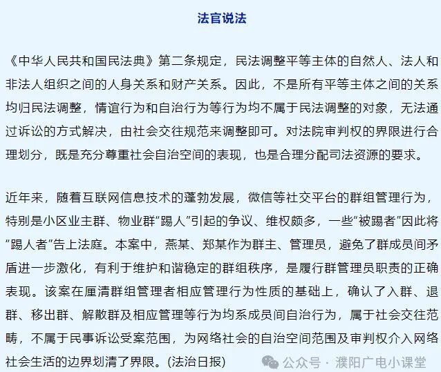 近年来,随着互联网信息技术的快速发展,微信等社交平台的群组管理行为引发了诸多争议和维权事件,一些“被踢者”将“踢人者”告上法庭。
