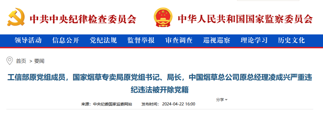 4月22日,中央纪委国家监委官网发布通报,工信部原党组成员,国家烟草专卖局原党组书记、局长,中国烟草总公司原总经理凌成兴因严重违纪违法被开除党籍。