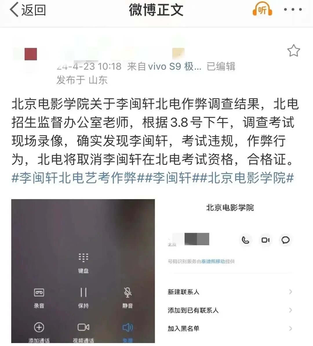 当晚,李闽轩通过视频公开道歉,并回应了作弊指控。她承认,自己未仔细阅读北电复试考生须知,误穿了绿色形体服,并未意识到这是违规行为。在自我介绍环节,由于紧张而报出了自己的姓名。她还透露,已放弃报考北京电影学院。