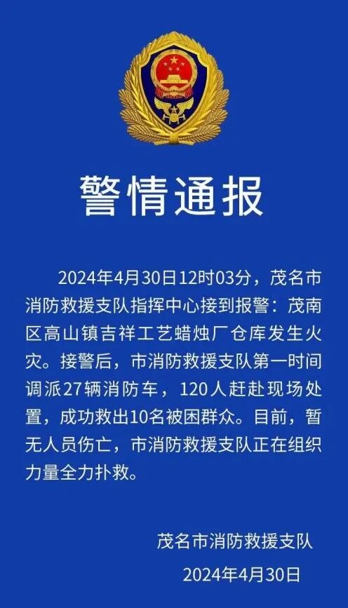 据茂名消防和极目新闻报道,2024年4月30日,茂名市茂南区高山镇发生了一起严重的火灾事件,一家蜡烛厂仓库突然起火,造成多人被困。在这场突如其来的灾难中,茂名市消防救援支队迅速响应,展现了出色的救援能力。