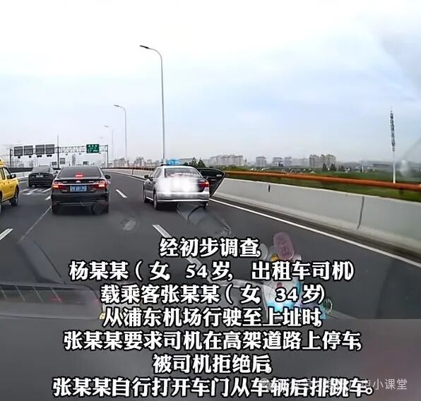 根据初步调查,事件的主角是杨某某(女,54岁,出租车司机)和乘客张某某(女,34岁)。杨某某驾驶出租车搭载张某某从浦东机场出发,当车辆行驶至上址时,张某某突然要求司机在高架道路上停车。在被司机拒绝后,张某某做出了一个危险的决定——她自行打开车门,从车辆后排跳了出去。