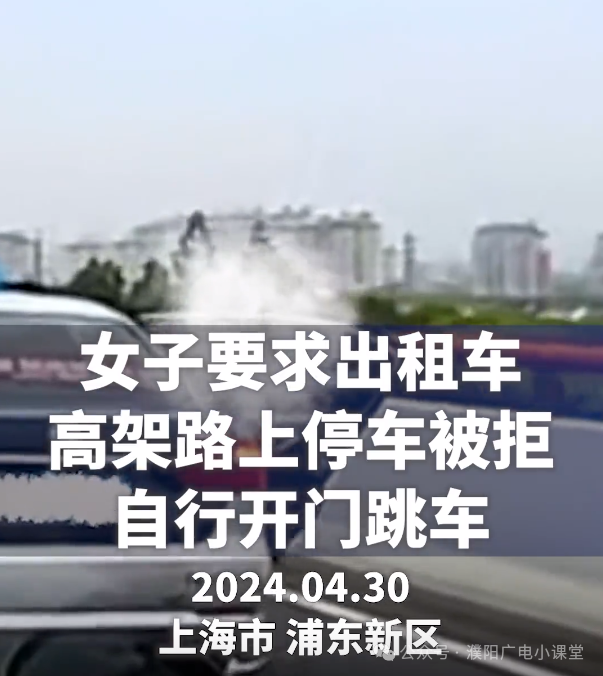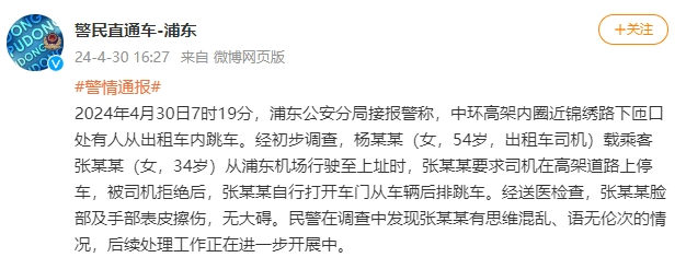 2024年4月30日,一个令人震惊的事件发生在上海的浦东新区。据@警民直通车-浦东的通报,当天早晨7时19分,浦东公安分局接到报警,称在中环高架内圈近锦绣路下匝口处,有人从出租车内跳车。