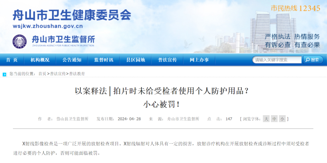 据华商报报道,近日,浙江舟山岱山县卫生健康局执法人员在对某医疗机构进行监督检查时发现,该医疗机构放射科有2名受检者正在进行X射线影像检查,现场均未佩戴使用个人防护用品。这一事件迅速引起了公众的关注,并登上了微博热搜。