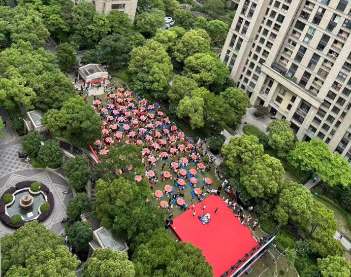 宴会的氛围非常热烈,从下午4点一直持续到晚上8点多。期间,小区还安排了舞狮、歌舞等表演,这些节目都是由业委会、楼道长和热心居民精心排练的。参与者们都收到了精美的礼品,而舞台最后变成了露天KTV,业主们纷纷上台展示自己的才艺,现场充满了欢声笑语。