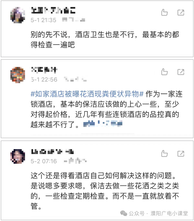 贵阳如家酒店花洒现异物事件的发生,提醒了酒店行业需要进一步加强卫生管理和服务水平。同时,也提醒消费者在入住酒店时,应留意房间的卫生状况,保护自己的合法权益。