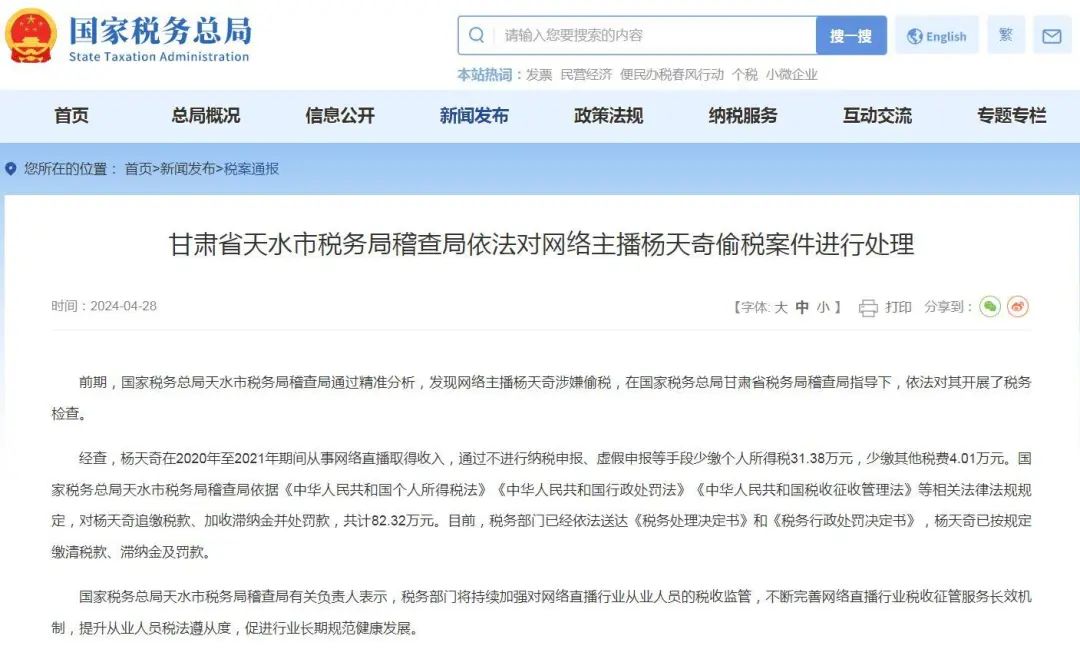 调查结果显示,杨天奇在2020年至2021年期间通过网络直播获得收入,却通过不申报纳税和虚假申报等手段,少缴个人所得税高达31.38万元,以及其他税费4.01万元。因此,国家税务总局天水市税务局稽查局依据相关法律法规,对杨天奇进行了追缴税款、加收滞纳金并处以罚款,总计达82.32万元。目前,税务部门已依法向杨天奇送达了《税务处理决定书》和《税务行政处罚决定书》,而杨天奇也已按规定缴纳了税款、滞纳金及罚款。