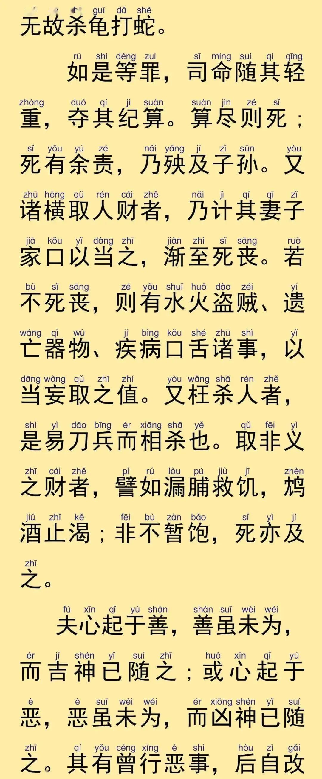 所以天地有专管查人过错的神明,根据人所犯过失的轻重,以算为单位,剥夺人的寿命。每减一算,则相应的罚他贫困损耗,且多遇忧愁患难之事,大家都厌恶他,刑法祸害就象跟着他一般,吉祥之事都回避躲开他,天上的主管过恶的星君降灾于他。以算为单位,将寿命减完了,其人则死。