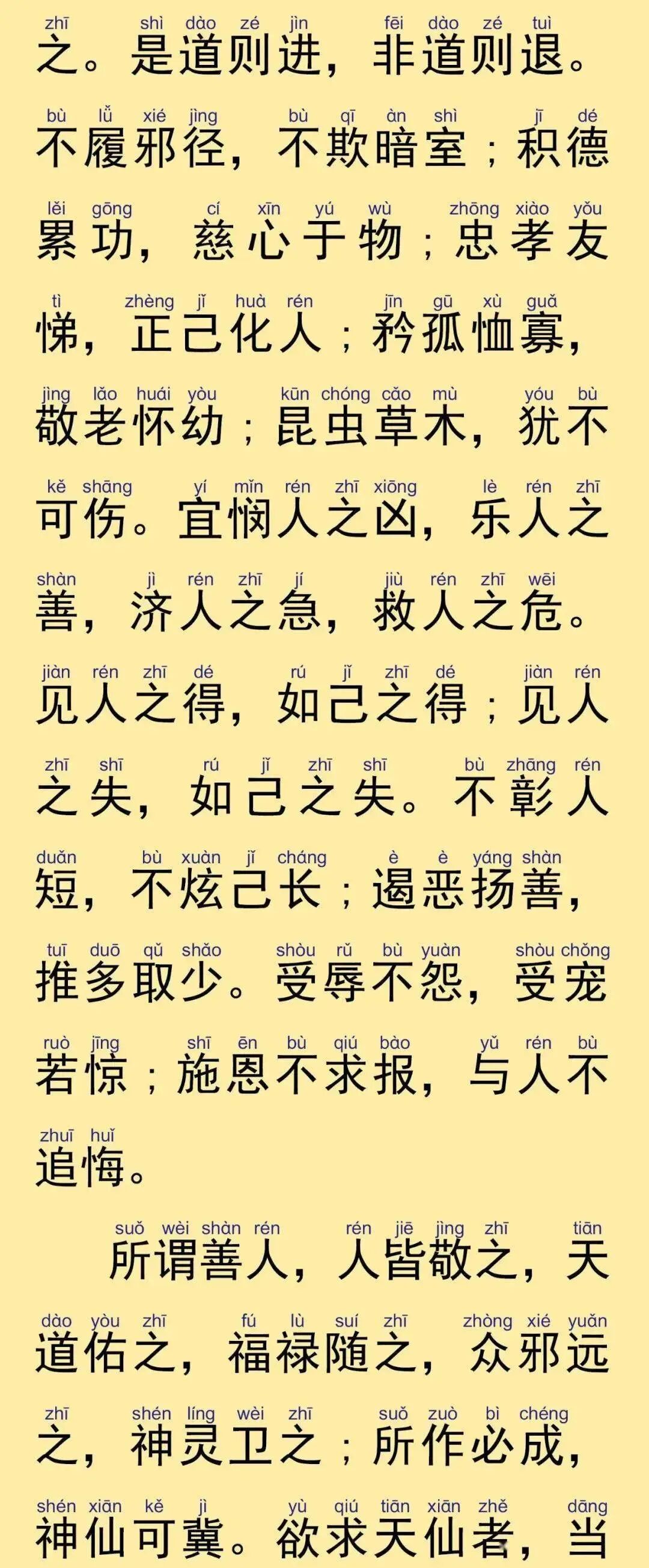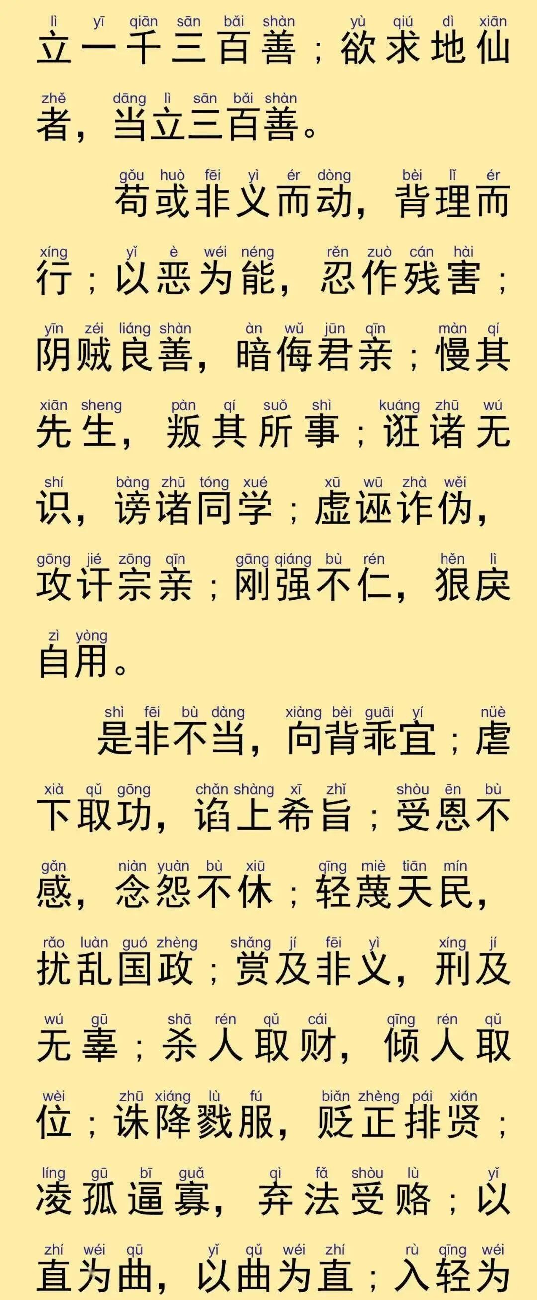 所谓善人,人皆敬之,天道佑之,福禄随之,众邪远之,神灵卫之,所作必成,神仙可冀。欲求天仙者,当立一千三百善。欲求地仙者,当立三百善。
