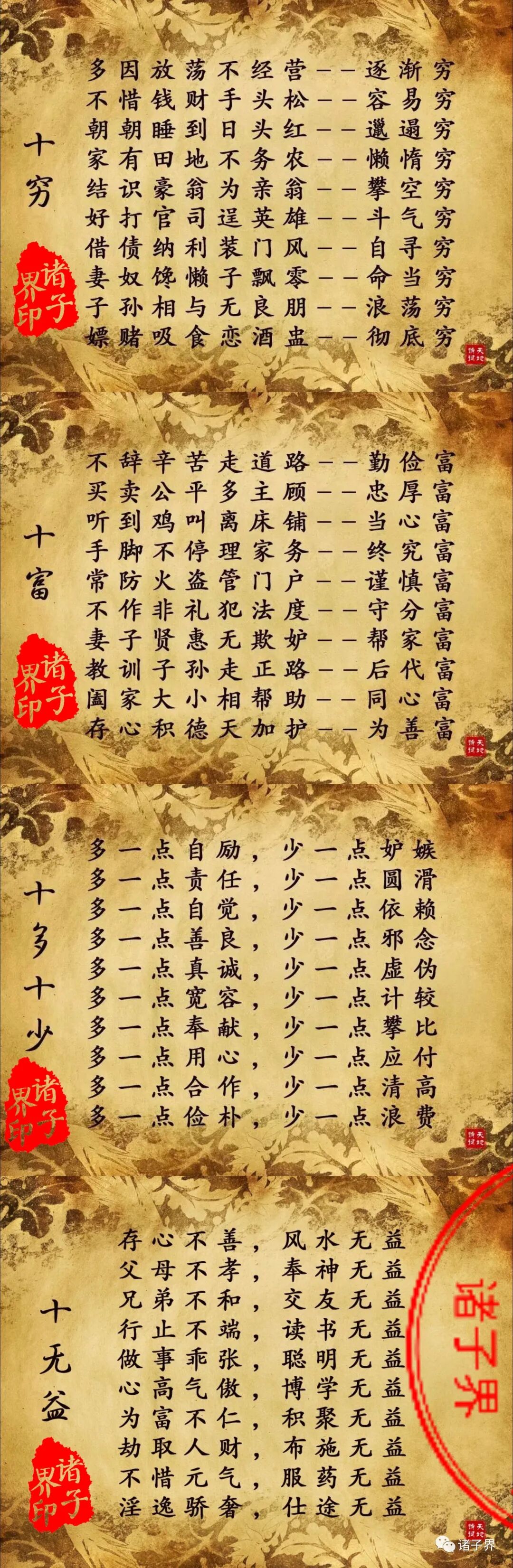 通读”十无益“格言,我们会发现现代人追求很多”无益”的事。当今社会被金钱物欲所充斥,很多人所做的表面文章大显其道,而忽略和忘记了自身的内在修养。(“诸子界”一直在强调的“形”&“神”问题。)