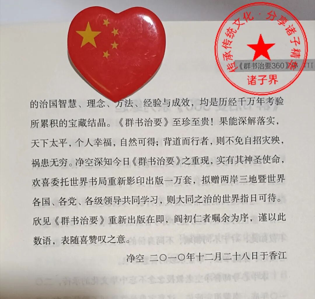 老祖宗留传至今的治国智慧、理念、方法、经验与成效,均是历经千万年考验所累积的宝藏结晶。《群书治要》至珍至贵!果能深解落实,天下太平,个人幸福,自然可得;背道而行者,则不免自招灾殃,祸患无穷。净空深知今日《群书治要》之重现,实有其神圣使命,欢喜委托世界书局重新影印出版一万套,拟赠两岸三地暨世界各国、各党、各级领导共同学习,则大同之治的世界指日可待。欣见《群书治要》重新出版在即,阎初仁者嘱余为序,谨以此数语,表随喜赞叹之意。