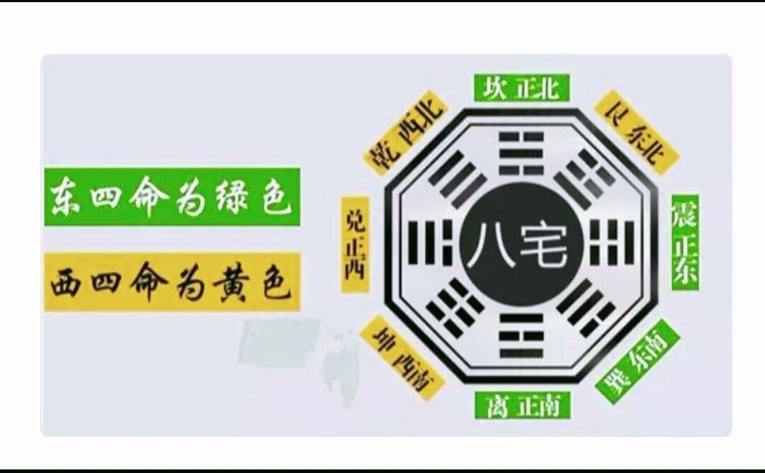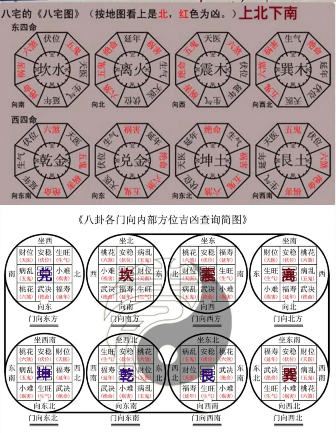 凭之判断自己特定的吉凶方位,在八个方位中,每个人的命卦都有四个“好方”和“坏方”:东四命: