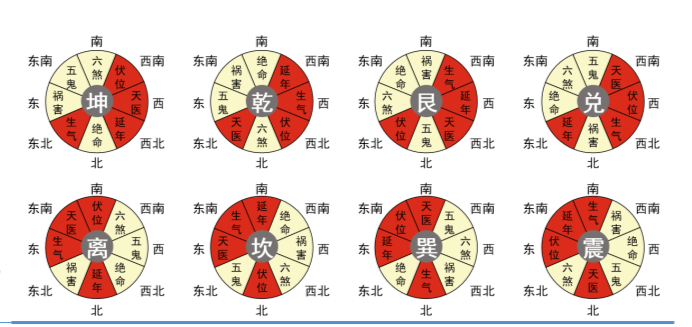 1、八卦方位:北为坎,南为离,西为兑,东为震。坎与震之间的东北位是艮,震与离之间的东南位是巽,离与兑之间的西南位是坤,兑与坎之间的西北位是乾。等距分布正好绕行一周。使用時以東四命住東四宅為吉,以東四命住西四宅為不吉的原則,再以生氣、延年、天醫、伏位四吉遊星所在的地盤宮位來開門、放床、安灶為吉;以絕命、五鬼、六煞、禍害四凶遊星所在的地盤宮位來開門、放床、安灶為凶。總而言之,東四命配東四宅,西四命就要配西四宅才為吉算,反之不吉 。