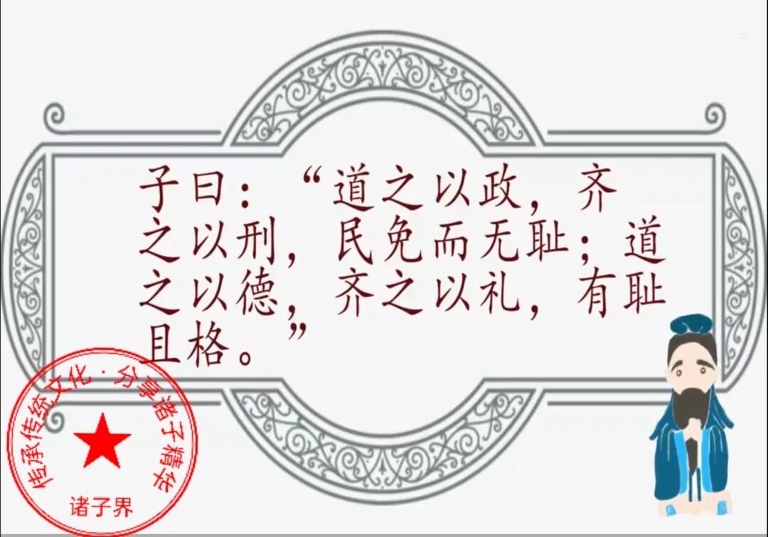 孔子说:「用政治来教化人民,用刑罚来管理人民,这样做,人民只想到如何免于刑罚,不会想到是不是可耻。用德行来教化人民,用礼义来管理人民,人民不但守法知耻而且能改过向善。」