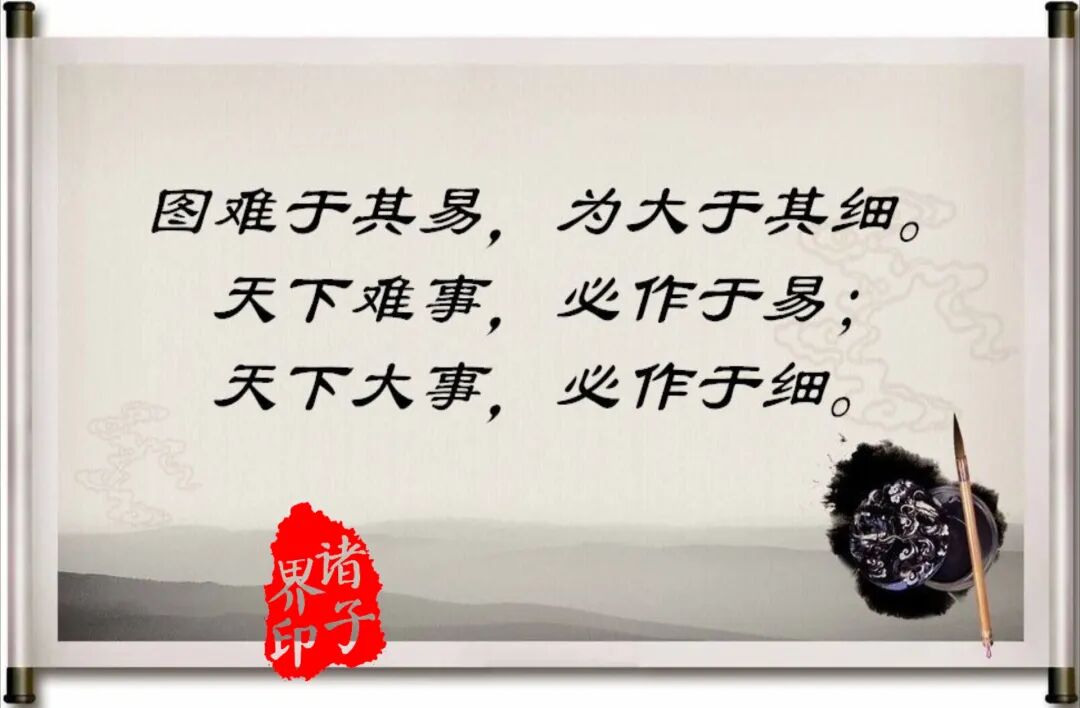 293.图难于其易,为大于其细。天下难事,必作于易;天下大事,必作于细。是以圣人终不为大,故能成其大。(卷三十四 老子)