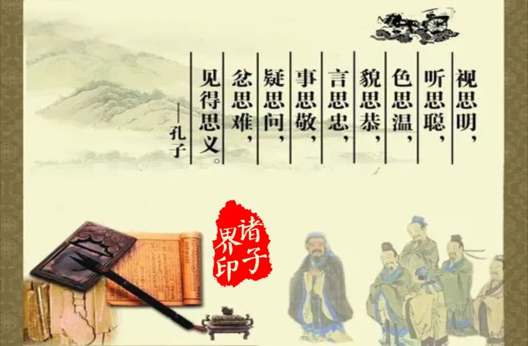 孔子说:「君子在九个方面多用心考虑:看,考虑是否看得正确;听,考虑是否听得明白;脸色,考虑是否温和;容貌态度,考虑是否谦恭;说话,考虑是否忠诚老实;做事,考虑是否认真谨慎;有疑惑,考虑应该询问请教别人;将发怒时,考虑是否会产生后患;见到财利,考虑是否合于仁义。」