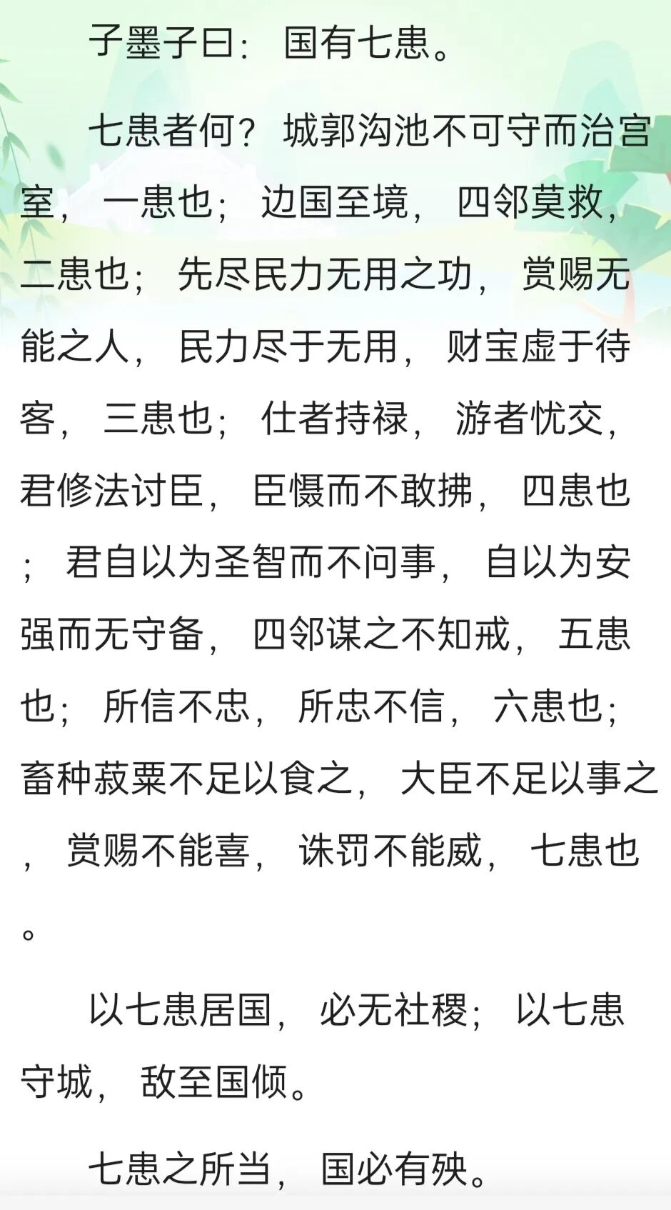 墨子说:国家有七种祸患。这七种祸患是什么呢?内外城池壕沟不足守御而去修造宫室,这是第一种祸患;敌兵压境,四面邻国都不愿来救援,这是第二种祸患;把民力耗尽在无用的事情上,赏赐没有才能的人,(结果)民力因做无用的事情而耗尽,财宝因款待宾客而用空,这是第三种祸患;做官的人只求保住俸禄,游学未仕的人只顾结交党类,国君修订法律以诛戮臣下,臣下畏惧而不敢违拂君命,这是第四种祸患;国君自以为神圣而聪明,而不过问国事,自以为安稳而强盛,而不做防御准备,四面邻国在图谋攻打他,而尚不知戒备,这是第五种祸患;所信任的人不忠实,而忠实的人不被信任,这是第六种祸患;家畜和粮食不够吃,大臣对于国事不胜使令,赏赐不能使人欢喜,责罚不能使人畏惧,这是第七种祸患。治国若存在这七种祸患,必定亡国;守城若存在这七种祸患,国都必定倾毁。七种祸患存在于哪个国家,哪个国家必有祸殃。