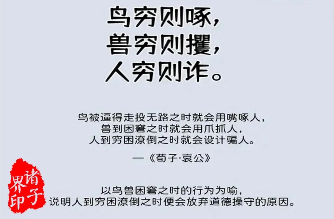 314.鸟穷则噣,兽穷则攫,人穷则诈,马穷则佚。自古及今,未有穷其下而能无危者也。(卷十 孔子家语)