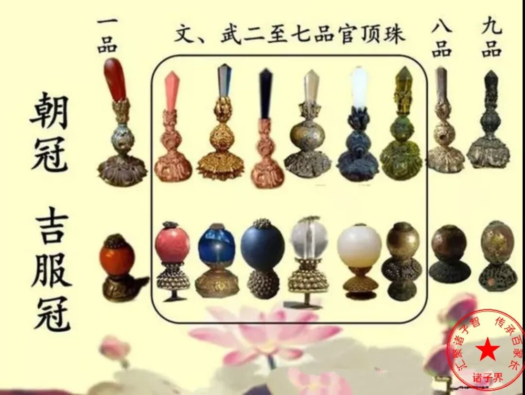 一品官员顶珠用红宝石、二品用珊瑚、三品用蓝宝石、四品用青金石、五品用水晶、六品用砗磲、七品用素金、八品用阴纹镂花金、九品用杨纹镂花金。