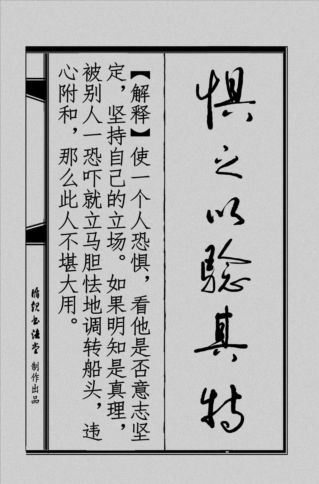使一个人恐惧,看他是否意志坚定,坚持自己的立场。如果明知是真理,被别人一恐吓就立马胆怯地调转船头,违心附和,那么此人不堪大用。