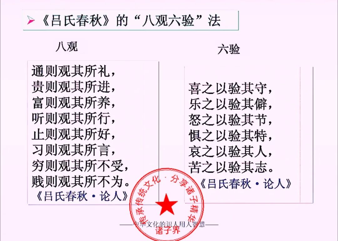 而吕不韦主持编撰的《吕氏春秋》,最精要的识人方法为“八观六验”。