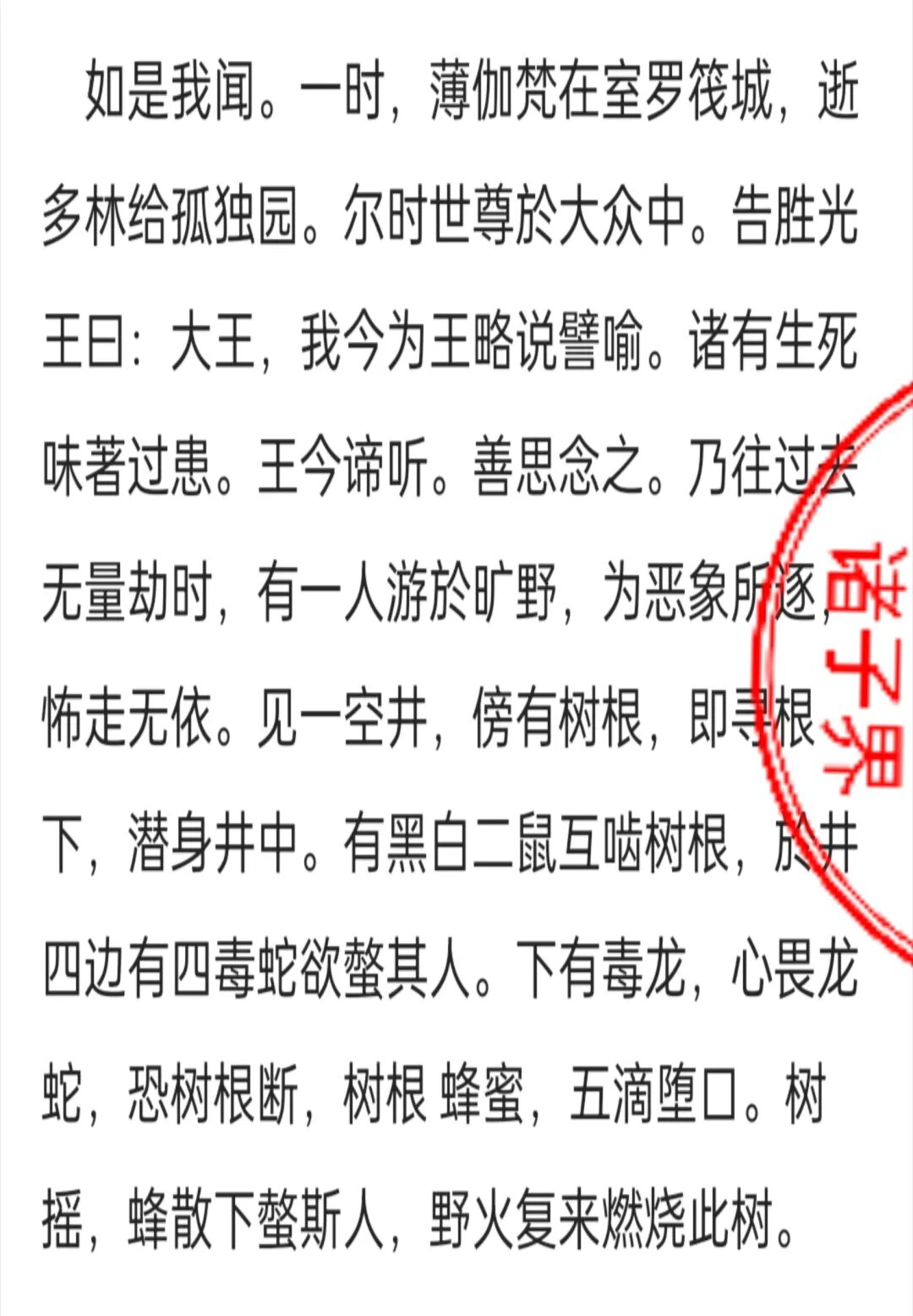 旷野无明路 人走喻凡夫 大象比无常 井喻生死岸 树根喻于命 二鼠昼夜同 啮根念念衰 四蛇同四大 蜜滴喻五欲 蜂螫比邪思 火同于老病 毒龙方死苦 智者观斯事 象可厌生津 五欲心无著 方名解脱人 镇处无明海 常为死王驱 宁知恋声色 不乐离凡夫