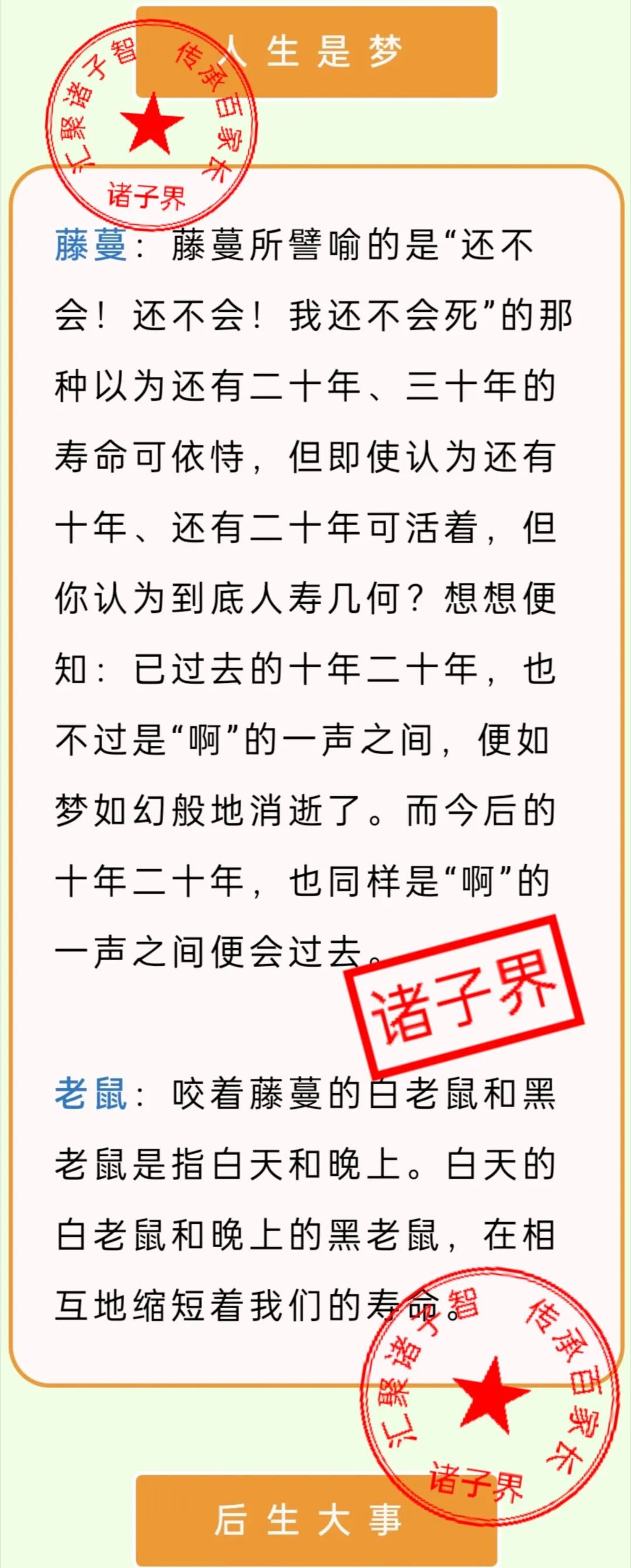 黑白二鼠比喻昼夜、时间。他们随时不停地咬噬着生命的“树根”,如同我们念念生灭。早晚这个树根都会被咬断。