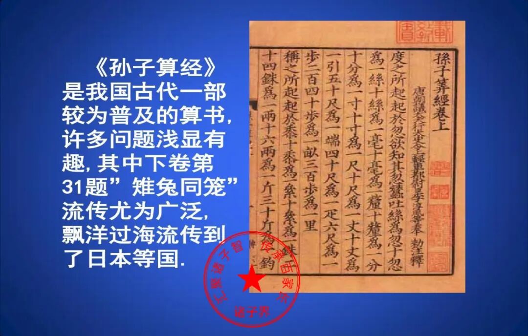 此孙子非春秋时期的孙子,其实这个孙子在历史上并没有留下名字,只是穿下了一部书籍——《孙子算经》而被命名为孙子而已;传本的《孙子算经》共三卷。卷上叙述算筹记数的纵横相间制度和筹算乘除法,卷中举例说明筹算分数算法和筹算开平方法。卷下第31题,可谓是后世“鸡兔同笼”题的始祖,后来传到日本,变成“鹤龟算”。