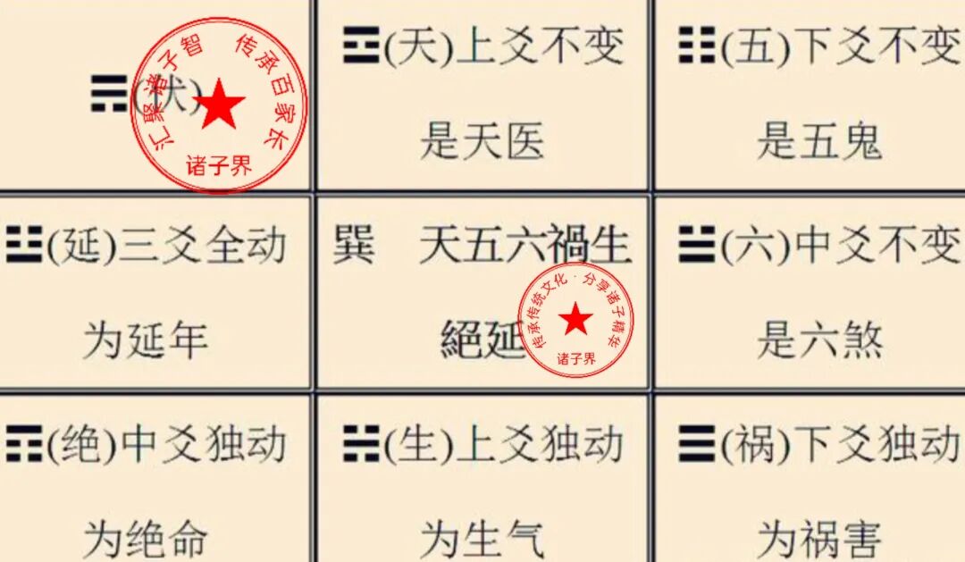 坎宫的对宫是巽宫,则从巽宫起生气,艮宫是五鬼,离宫是延年,乾宫是六煞,兑宫是祸害,震宫是天医,坤宫是绝命,坎宫是本宫伏位。