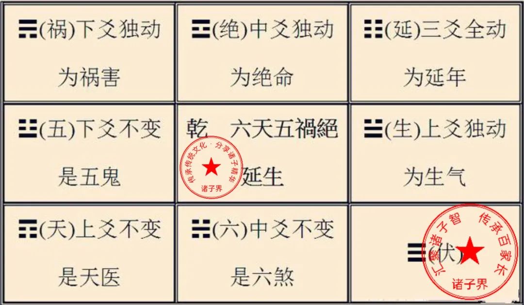 乾宫的对宫是兑宫,则从兑宫起生气,震宫是五鬼,坤宫是延年,坎宫是六煞,巽宫是祸害,艮宫是天医,离宫是绝命,乾宫是本宫伏位。