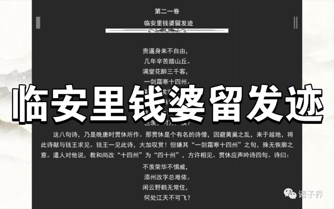 这八句诗,乃是晚唐时贯休所作。那贯休是个有名的诗僧,因避黄巢之乱,来于越地,将此诗献与钱王求见。钱王一见此诗,大加叹赏,但嫌其“一剑霜寒十四州”之句,殊无恢廓之意,遣人对他说,教和尚改“十四州”为“四十州”,方许相见。贯休应声,吟诗四句。诗曰: