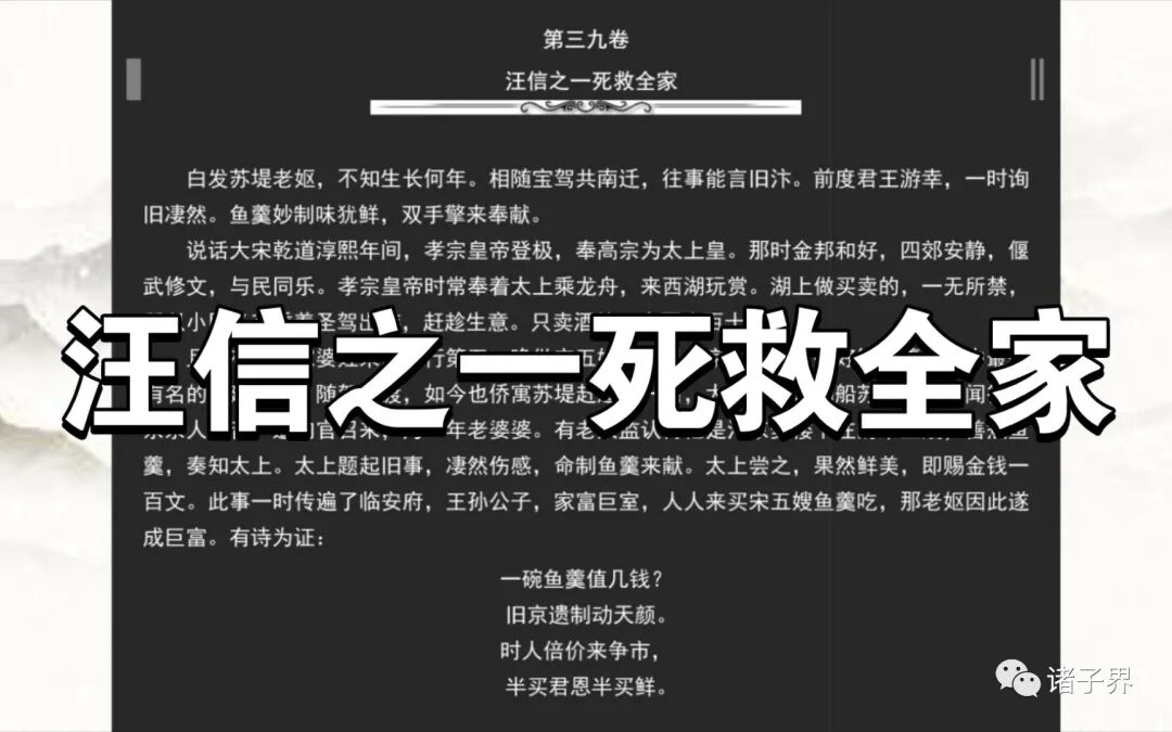 话说大宋乾道淳熙年间,孝宗皇帝登极,奉高宗为太上皇。那时金邦和好,四郊安静,偃武修文,与民同乐。孝宗皇帝时常奉着太上乘龙舟来西湖玩赏。湖上做买卖的,一无所禁,所以小民多有乘着圣驾出游,赶趁生意。只卖酒的也不止百十家。 且说有个酒家婆姓宋,排行第五,唤做宋五嫂。原是东京人氏,造得好鲜鱼羹,京中最是有名的。建炎中随驾南渡,如今也侨寓苏堤赶趁。一日太上游湖,泊船苏堤之下,闻得有东京人语音。遣内官召来,乃一年老婆婆。有老太监认得他是汴京樊楼下住的宋五嫂,善煮鱼羹,奏知太上。太上提起旧事,凄然伤感,命制鱼羹来献。太上尝之,果然鲜美,即赐金钱一百文。此事一时传遍了临安府,王孙公子,富家巨室,人人来买宋五嫂鱼羹吃。那老妪因此遂成巨富。有诗为证: