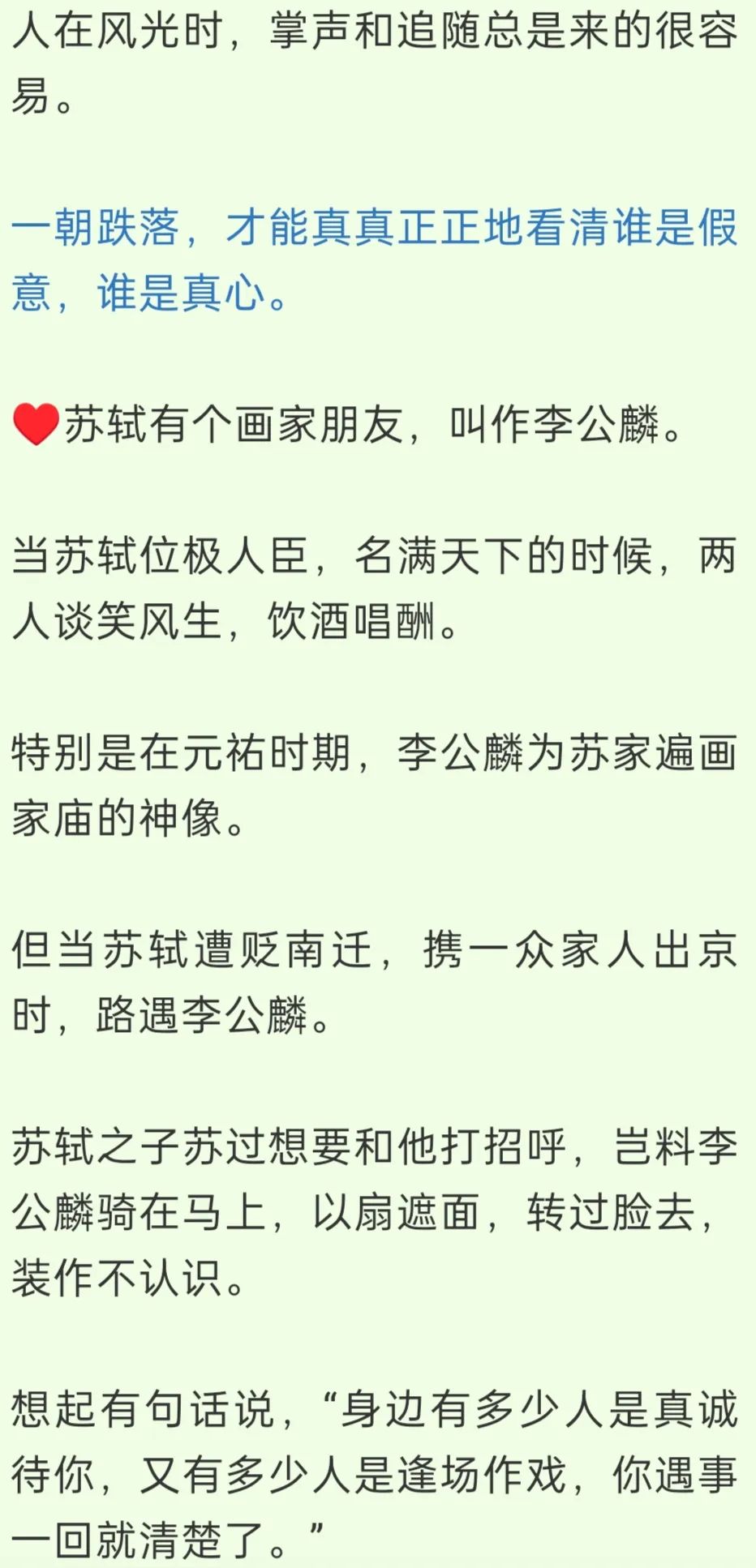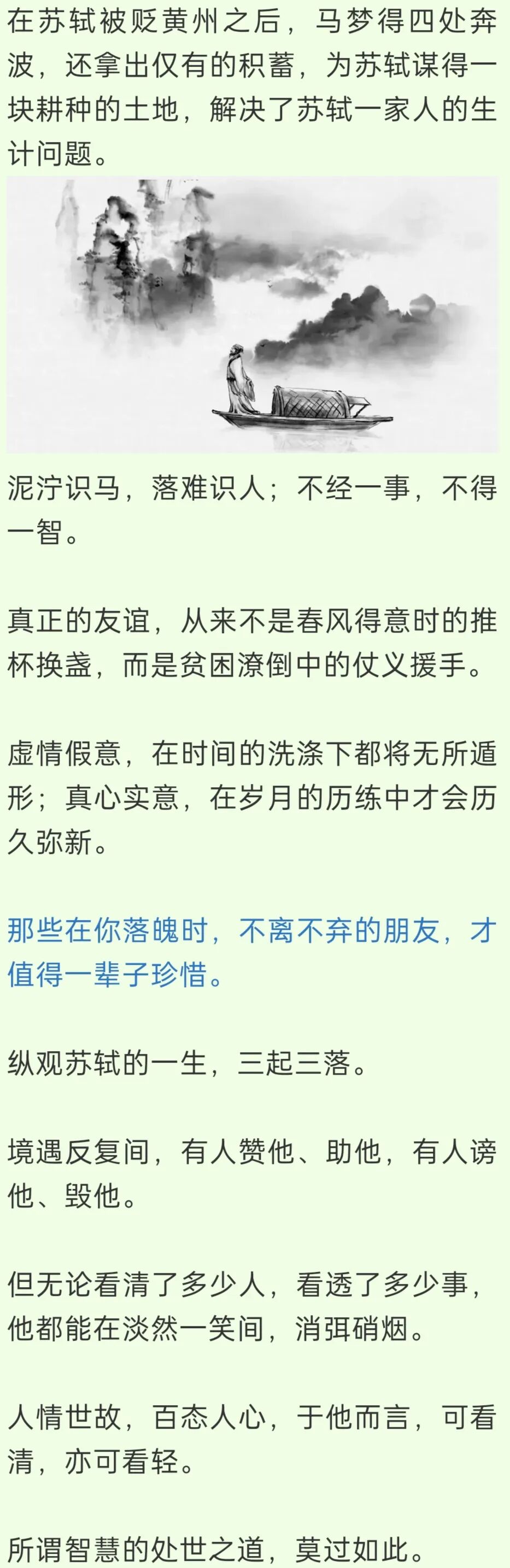 在苏轼身边,还有另外一群人。他们在苏轼落魄时送来温情无数,在其身处逆境之时给予最大的善意。♥比如陈师仲。“乌台诗案”后,陈师仲受到株连,饱受苦楚。但他毫不介意,一再主动给苏轼写信。平时所作诗文,“十常四五”提及苏轼兄弟。就连苏轼也忍不住感叹道:“何相爱之深也。”♥比如马梦得。马梦得是出了名的穷人。苏轼曾在日记里写道:我和梦得同年同月出生,我俩都是穷鬼,但一比较,还是梦得更穷一点。