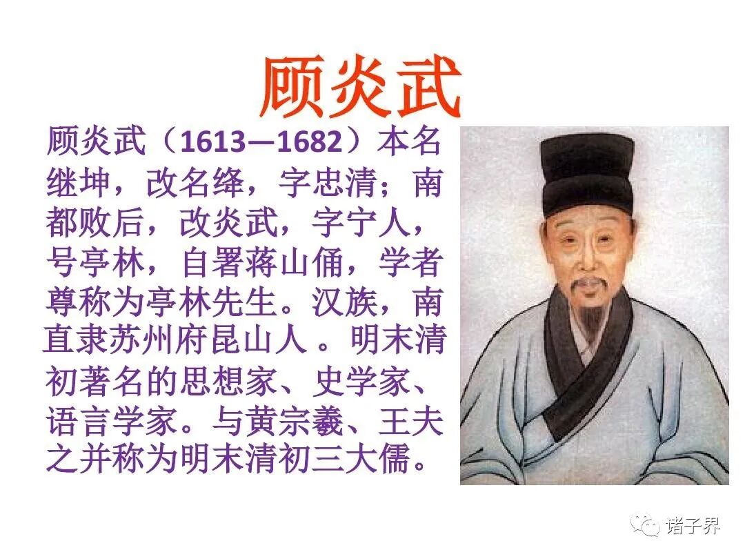 顾炎武(1613-1682),苏州府昆山县 ( 今江苏昆山 ) 千灯镇人,原名绛,字忠清。明亡后改名炎武,字宁人,亦自署蒋山佣。尊称为亭林先生。明末清初著名的思想家、经学家、史地学家、语言(音韵)学家。与黄宗羲、王夫之并称为明末清初“三大儒”,被誉为清学“开山始祖”。