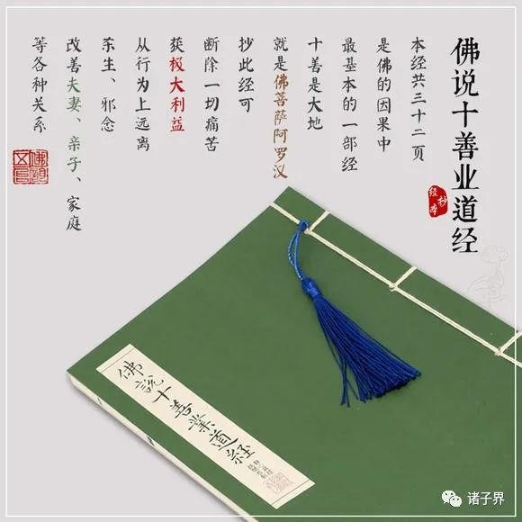 十善业道经,又名《佛为娑伽罗龙王所说大乘经》,北宋施护所译为同经异译,本经出自西晋月氏国三藏竺法护译《佛说海龙王经》,为其第十一品《十德六度》,是释迦牟尼佛在娑竭罗(意为:咸水海)龙宫,为龙王所宣说的经典,即诸佛菩萨有一方法,能断除一切痛苦,获取极大利益,这个方法就是修行十善业道,即从行为上远离杀生、偷盗、邪淫;从语言上远离妄语(说谎)、两舌(挑唆)、恶口(语言粗俗)、绮语(花言巧语);从思想上远离贪欲、瞋恚、愚痴。离此十种恶业,就是修行十种善业。