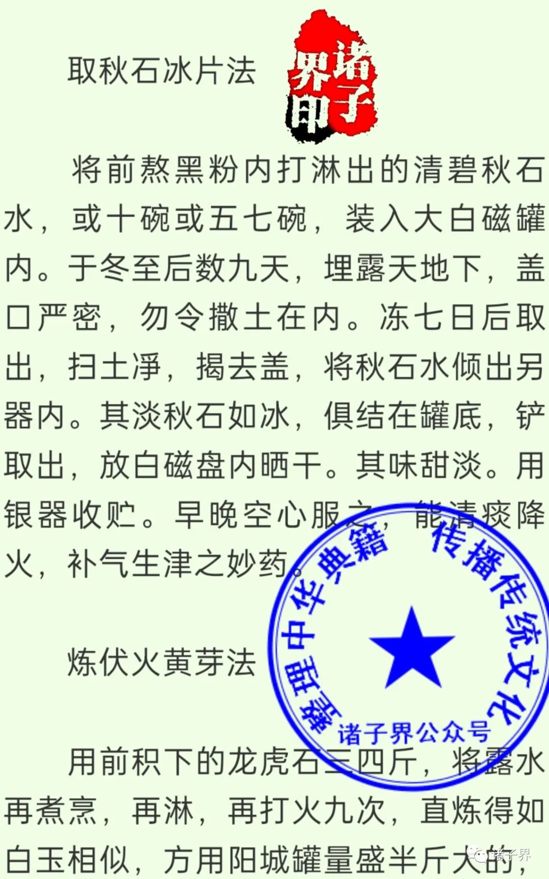外用猪毛泥固谨,晒干,收抹凈,罐内约装秋石半斤在内,坐入明炉内,风匣大火化开成清汁,方用前缸上收的已汞点上,以白点白,以红点红,以黑点黑,即成伏火黄芽。待汁清,取出冷定,成一白玉陀。其色难定,或如玉,或金色,或白中带红,或黑色。丹书云:“其白容易得,一黑最难求。”所以分有五色,以应五形,内滋五脏,实乃养生之至药也。郑思远诀曰:“淮南炼秋石,黄蒂发金花,秋石原非石,金花不是花。花从秋里得,石向春中葩。子母同一处,如住仙人家。秋石是真铝,金花号黄芽。黄芽非别物,内象取精华。” 取秋石汞花法 将磁盘煎取龙虎石时,看煎至六分干时,滚起圆泡,急将银茶匙挑起,放白绵纸上晒干,银器收贮。此汞花最是轻清先天之药。服之令人肌肤莹光,身体壮健,其功无比。 炼黄芽法 将前初炼秋石,锅熬成黑膏时,缸合升取的已汞灵药,先拣置小白罐口如钱大者,用猪毛泥固济,阴干。将灵汞五钱,或一两,装入罐内。口用白破碟底相成圆钱,坐口上,以铁线扎紧,盐泥封固缜密,用火炙干口。地下钉钉三个,离地二指高,将药罐坐上。用砖砌百眼炉,先用底火慢慢烧四寸香,渐渐加至小半肚火一炷香,口上用新笔涂水湿盖,香尽去火,冷定,开出,其黄芽升在罐盖上,起下如金色一饼。此乃是龙虎初弦至美之气,名曰金花,又曰黄芽。服之令人五脏化生先天精气元神,袪除百病,消化痰涎,自保长生也。 炼白雪法 亦将已汞灵药,照取黄芽法一样封固,打火。盖黄芽初阳之气,易走易飞,宜火小。火小,色变轻黄,即黄芽。白雪乃二阳之气,比黄芽火候略加大些,其药自然变白。此黄白造化,乃天地阴阳人元自然变化,非人功力所为也。火足冷定,将下一饼如白玉之象,亦是龙虎至英之气,名曰白英,又号白雪。服之令人自然三田生气,五脏添华,百病不生,诸痰永息,精神壮,而病自安矣。 取冬冰法 将炼龙虎石时取清碧之水,用茶盅十个,各盛半碗在内,于数九天摆在露下。次日早,水面俱结冰,以小刀贴碗周围,轻轻画离碗边,挑取出轻放大冰盘内,晒干,即如春饼样的圆冰花。令人清晨将些须入口噙化,生津化痰,其功甚效。 至妙晒炼干秋石法 (此石乃人之精气结成,岂容见火烧炼以伤生气?惟此法乃得人元至妙大理最上一乘。) 择僻静去处筑一台,高三尺三寸,上置缸五口,积龙虎水五满缸,于三伏天露晒,遇风雨盖之。晒至半缸,并成三缸,仍晒仍露,至只得二三斗之数,方取不见水的新砖十二个,浸入水内一夜,第二日取出晒干,至晚又浸,如此直待水通干了为止。寻一幽阴静室,打扫洁凈,地下喷水湿,以竹劈成篾片,稀铺湿地上。将浸的砖侧摆篾上,上用筐盖,周围泥封口缝,荫七日开看。其砖上生出秋石如白玉苗,一二寸长,轻扫下来收在银器内。将前砖照前仍取五七次,直待不生为止。此炼法不经水火,不泄元灵,惟仗日精月华煅炼,亦得助气添灵。如服此石,比水火煅者,加功效过半矣。 混元球制取甜秋石法 于僻静露天去处,置缸三五口,积满龙虎水。于三伏天,日晒夜露,遇风雨盖之,天青去盖,直晒至水耗,只存至大半缸。将混元球十数个浸入内,盖之勿动,直过冬待至第二年三伏天,方取出球来,于日中晒。伏尽,剖破其球,内生白雪玉英。其味甘美,极能补心血,化老痰。浸球的缸底,亦结生如冰相似,亦取出晒干,另合药用。功亦同前。