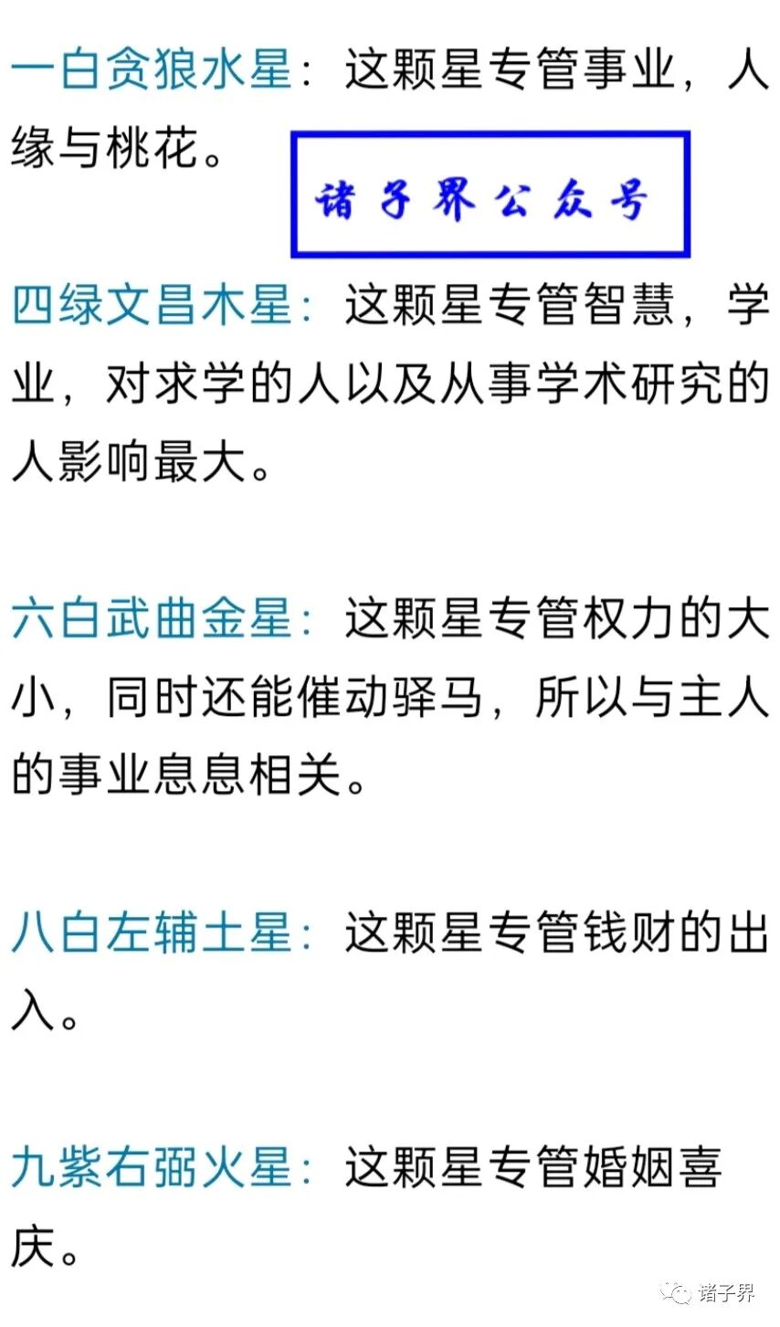但是,并不是说是吉星就一定好,是凶星就一定差,由于每年飞临的宫位不一样,前述的五颗吉星固然可能会带有凶性,后面的四颗凶星有时候也会沾染喜气,不是永远一成不变。(诸子界小编提醒各位同学:凡是正能量的说法,咱要弘扬中华优秀传统文化;凡是带有阻吓类的言辞,咱要批判其中的封建迷信糟粕。)