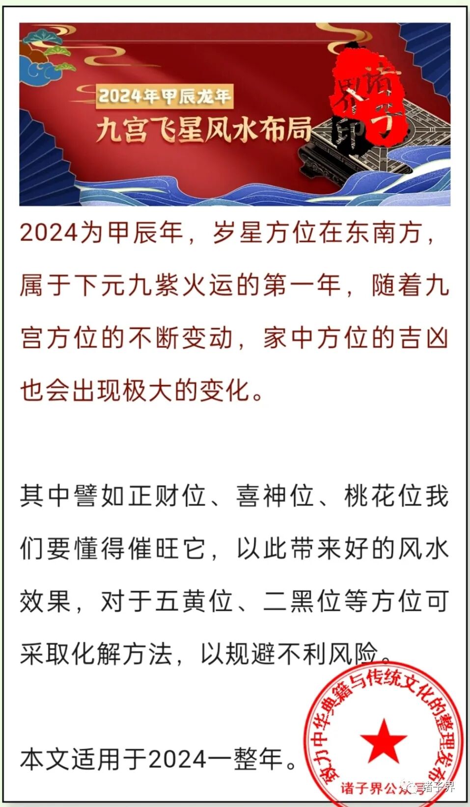 八白左辅星代表着贵人、事业和财富等,2024年八白左辅星飞临的方位是正北方,这也是本年度的正财位所在之处,五行属性为土,在八运时为当旺之星,但进入九运成为退气之星,有些可惜,所以,龙年想要大利财运,对谁来说都有难度。(也就是说,明年依旧不适合置业投资)