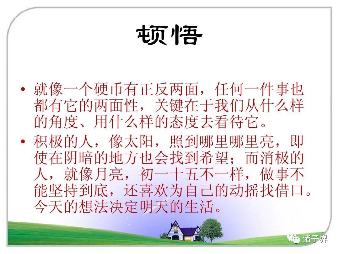每个人看问题的角度不一样,所得的结论也不一样。我们的想法导航着我们前进的方向,用积极还是消极的思维模式往往决定着事情的成败。