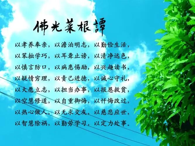 时刻见人不是,此即种下诸恶之根苗;时刻见己之非,此乃广开万善之门户;时刻责怪别人,必定自己有诸多错失;时刻检讨己过,必能获得别人的欢喜。 能容小人是大人,大人无所不容;能处薄德是厚德,厚德无所不德。 不夸小善,终积大德,正如涓流,点滴汇聚,终成大海;不除小恶,终必败事,则如磨石,不见其灭,曰有所损。 猜忌,使我们远离信任的目光;怀疑,使我们错过幸福的召唤;嫉妒,使我们模糊朋友的面貌;妄想,使我们失去现世的拥有。 一念瞋心如火,烧尽累劫功德之林;一念人我是非,积聚善念付水漂流。 贪图虚名者易遭损;无德求福者易遭困;无功受禄者易遭辱;争名夺利者易遭谴。 不尊重自己者,容易取辱;不畏惧自己者,容易招祸;不自满自高者,必能受益;不自是自豪者,必得人缘。 权重而不专擅者必贤;多金而不悭吝者必仁;才高而不傲物者可师;得意而不忘形者可敬。 勿以恶小而可为,小恶如水穿石;勿以善小而不为,小善如息日增;勿以权大而可畏,权大久必自倾 ;勿以胆大而不畏,胆大久会自危。 自信者毁誉不能改其志;知足者权利不能变其节;静心者恩怨不能乱其神;有德者是非不能扰其心。 无财非贫,无学为贫;无位非贱,无耻为贱;无寿非夭,无志为夭;无子非孤,无德为孤。 物非义不可取;事非见不可说;人非善不可交;念非正不可举。 小小金刚,能坏须弥;小小星火,能够燎原;小小细菌,会伤身体;小小忏悔,能破大恶。 师父弟子不怕分离;能善强者不怕困难;善人君子不怕冤枉;道人学者不怕贫穷。 水不动者,湖泊不清;志不强者,智力不远;言不信者,行持不果;心不坚者,道学不成。 忍难者必能奋斗;忍辱者必能知耻;忍气者必能和谐;忍苦者必能甘美。 乐观者,英「气」焕发,人见人爱;易怒者,杀「气」腾腾,人见人怕。
